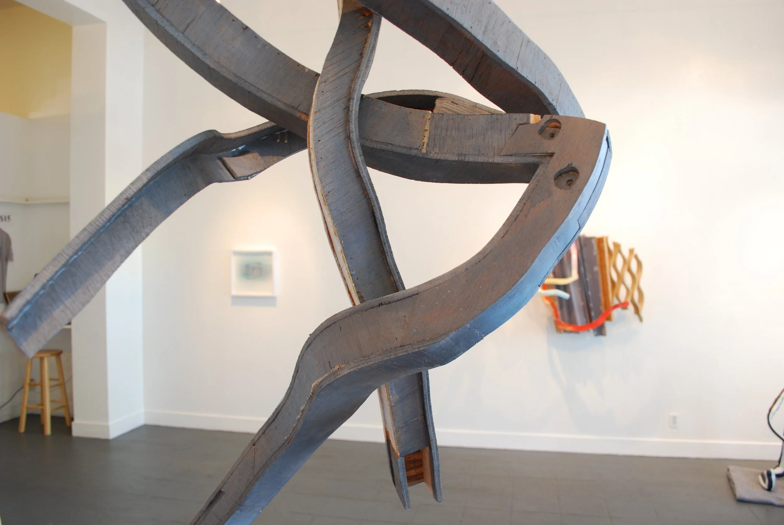 Rajkovich’s abstract sculptures explore material’s ability to conceal, reveal, and disguise. Each work suggests its own character through posture and surface appearance. Together they interact, with some works seeming exposed and sincere, and others dressed up and adorned. This collection represents a continued departure from the artist’s earlier, highly finished works of brightly colored cast plastic. Now Rajkovich leaves the process of making the works visible, and the audience to decipher whether or not color is inherent to the material. By objectifying the creative process and providing clues to its material and formation, Rajkovich offers the viewer a shared experience of assigning narrative to the work itself.The pieces are fabricated from several materials including bendable plywood, steel, plastic, and found objects.